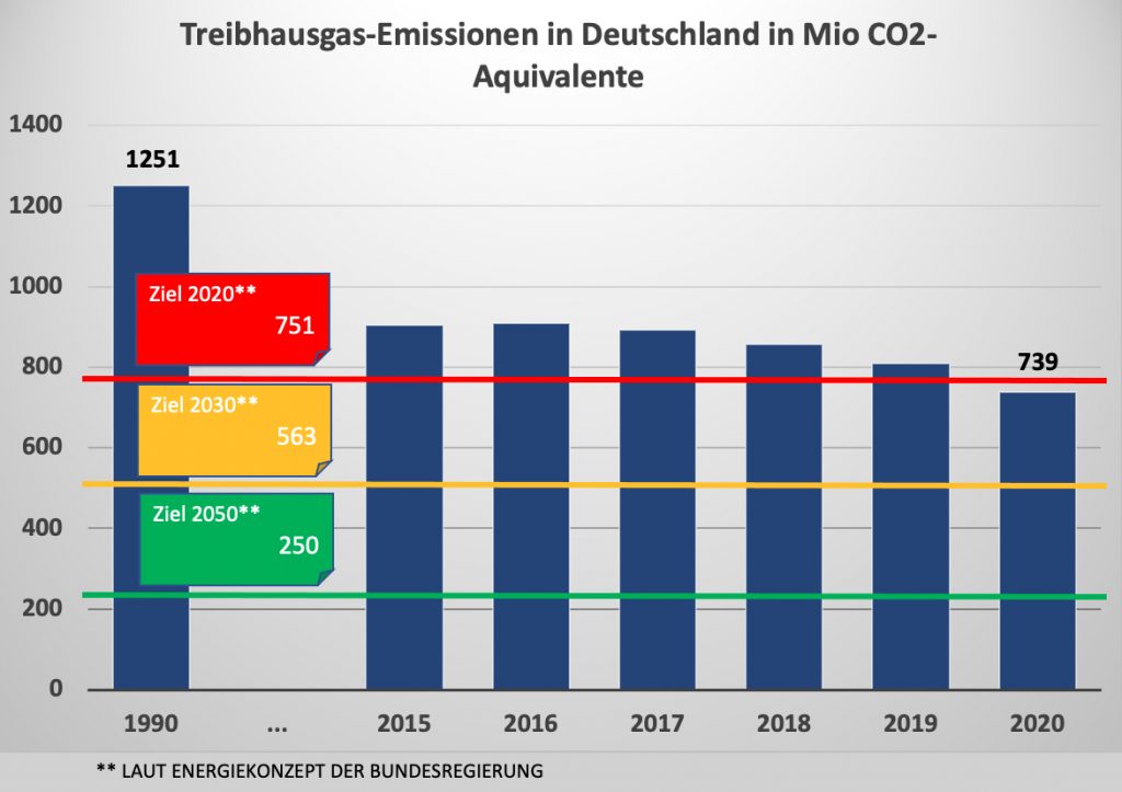 Deutschland hat die gesetzten Klimaziele im Jahr 2020 nach aktuellen Schätzungen erstmals erreicht. Die Emissionen sinken 2020 erstmals um 8,7 % auf 739 Mio. Tonnen.