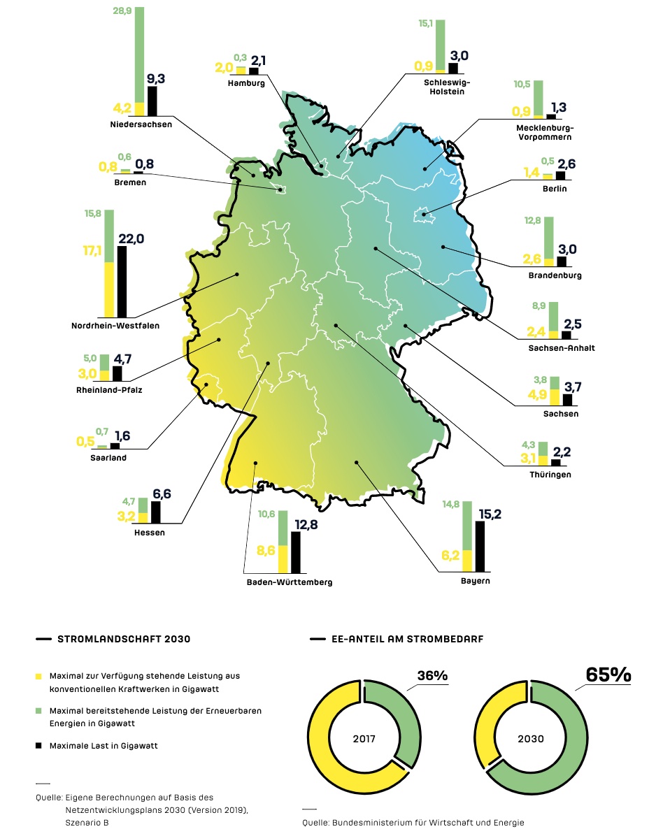 Die Stromproduktion von Windenergie- und Photovoltaikanlagen ist abhängig von äußeren Bedingungen. So schätzen die Übertragungsnetzbetreiber, dass deutschlandweit Windenergie- und Photovoltaikanlagen im Jahr 2030 an wind- und sonnenreichen Tagen bis zu 133 Gigawatt Leistung bereitstellen werden. Die prognostizierte Last liegt jedoch bei maximal 92 Gigawatt, in vielen Stunden des Jahres sogar erheblich darunter. Folglich wird es immer häufiger Zeiten geben, in denen das Angebot der Erneuerbaren Energien die Nachfrage teils deutlich übertrifft. Umgekehrt gibt es jedoch auch Zeiten, in denen die Witterung nicht günstig ist.